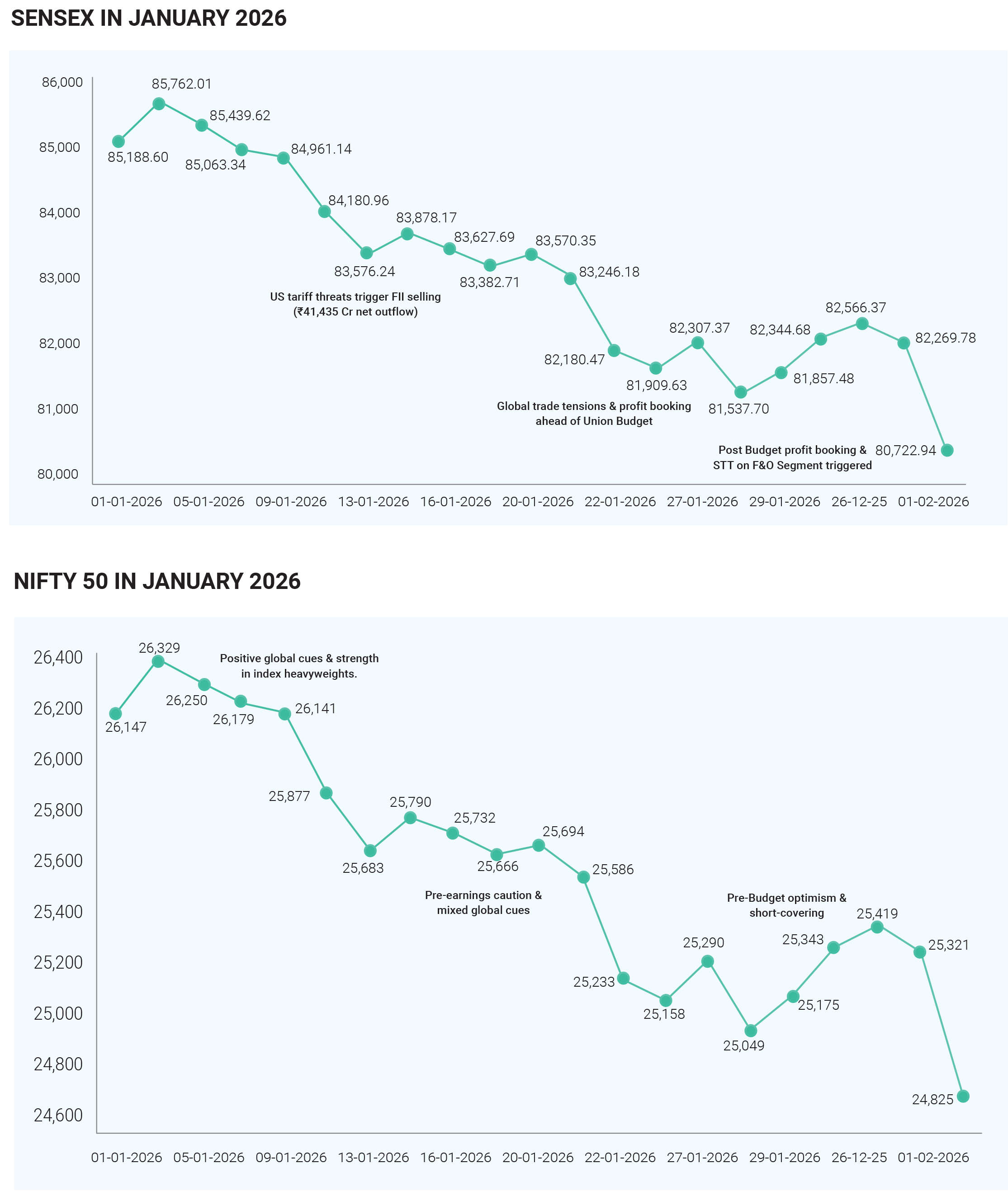 The divergence between foreign selling and domestic buying prevented deeper drawdowns, kept market breadth tilted toward liquid frontline stocks, and reinforced the perception that domestic capital had become the marginal price-setter. Sectoral performance was notably differentiated compared with November’s broad-based rally: IT stocks benefited from sustained global demand for digital and AI-linked services and from rupee weakness, which supported earnings translation and margins; healthcare and pharma held up well as defensive plays with stable demand visibility, particularly in domestic-focused names and hospital chains; energy stocks outperformed on value buying and policy support, with integrated and downstream players aided by lower crude prices and expectations of healthy refining margins; financials delivered mixed but generally supportive performance, with PSU banks and select rate-sensitive lenders gaining on expectations of strong credit growth and an accommodative policy path, while some private banks faced intermittent pressure due to concerns around net interest margin compression and pockets of asset-quality stress; consumer sectors saw profit-taking in FMCG after earlier resilience despite improving volume trends and easing inflation, while discretionary stocks were stock-specific, with autos supported by demand and rate-cut hopes but retail names consolidating after sharp prior rerating; utilities remained among the weaker segments, as concerns around tariffs, demand visibility and operational pressures capped enthusiasm, limiting buying to balance-sheet-strong names; and metals and industrials moved in a choppy but mildly positive fashion toward month-end, helped by import-related policy measures, domestic capex expectations and year-end positioning despite uneven global demand indicators. The macro backdrop during the month remained largely supportive domestically: Q2 FY25 GDP growth around 8% exceeded expectations, inflation stayed benign, and the RBI delivered a dovish policy signal by cutting the repo rate by 25 basis points to 5.25%, announcing ₹1 trillion in open market operations and a USD 5 billion buy/sell swap to inject liquidity, which helped soften bond yields and underpin sentiment. However, these positives were tempered by external pressures, including a firm US dollar, weak emerging-market currencies, geopolitical uncertainty, US trade policy risks, China’s deflationary signals, and falling crude prices, all of which reinforced caution among foreign investors. The rupee’s nearly 2% depreciation over the month weighed on foreign returns but also highlighted India’s relative resilience: instead of triggering disorderly selling, equities absorbed the shock through sideways movement as domestic flows cushioned the impact. By year-end, market positioning clearly favoured quality, earnings visibility and balance-sheet strength over high-beta momentum, with index valuations cooling modestly from peak optimism but remaining supported by earnings delivery and liquidity. Overall, December 2025 closed with Indian equities in a deliberate, balanced stance: headline indices near record highs but without exuberance, foreign investors cautious but not capitulating, domestic institutions firmly in support, and the market entering 2026 consolidated, selective and grounded in fundamentals rather than momentum.